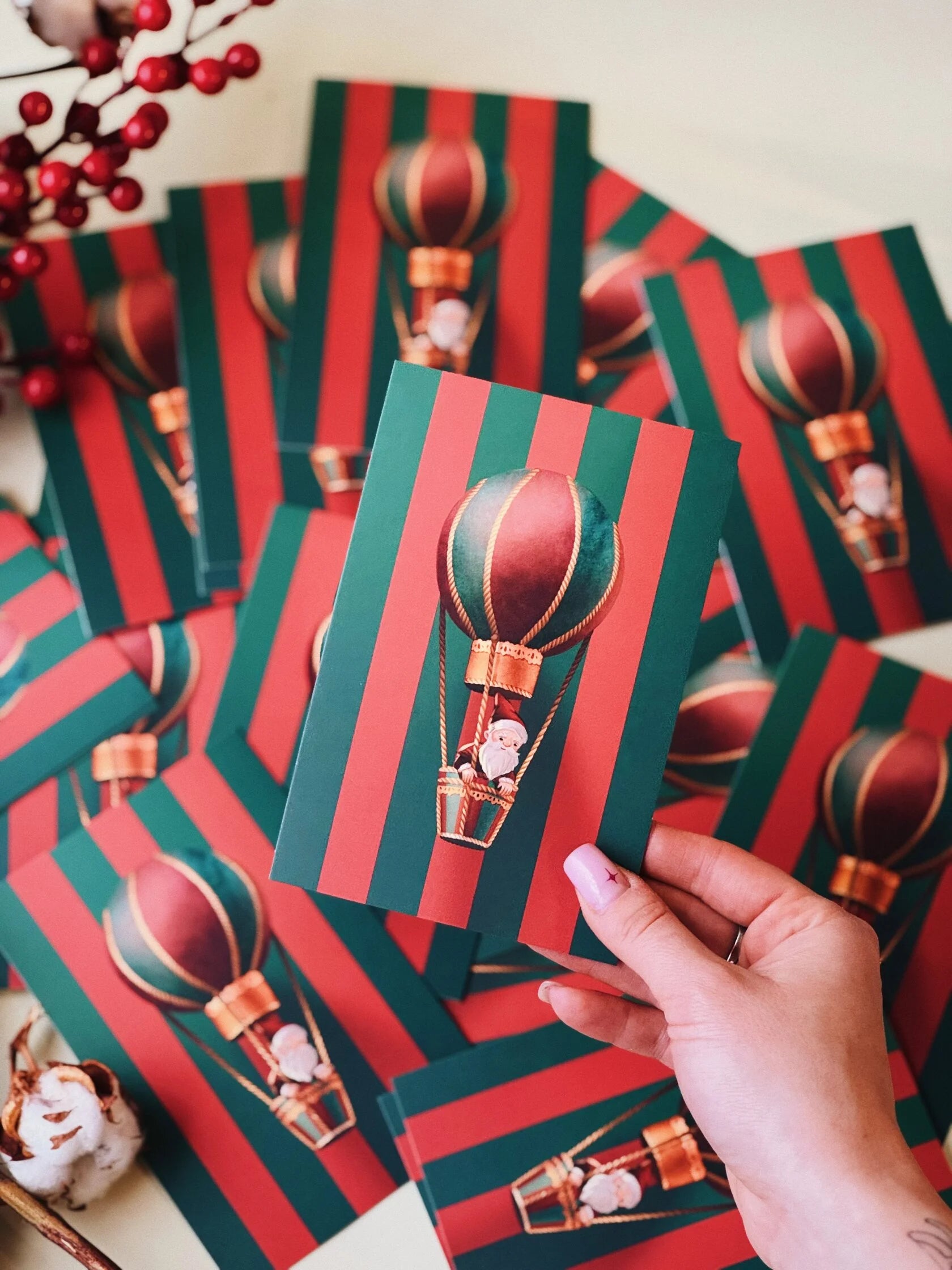 A festive 10×15 cm art postcard inspired by vintage holiday aesthetics and the magic of winter journeys. The illustration features Santa drifting through the air in a hot air balloon, set against bold red and deep green stripes that evoke classic Christmas wrapping and nostalgic fairground charm. Printed on premium thick cardstock with a smooth matte finish, this postcard feels rich and substantial, making it perfect for holiday greetings, seasonal gifting, or decorative styling. A beautiful choice for Christmas lovers, design-led shops, cafés, and anyone who appreciates playful yet elegant holiday illustrations.